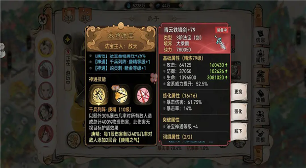三阶法宝单体技能推荐金牙/金骨,群体推荐金铜,两种法宝均有不俗的伤害。法宝炼化pvp建议炼化物伤,pve建议炼化爆伤。