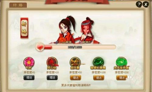 4、提升亲密度:通过赠送礼物提高亲密度,达到一定程度后便可结婚;