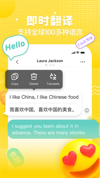根据你的国籍、语言和爱好,帮你找到最适合的聊天朋友,免费聊天还能翻译,和外国朋友聊天超轻松。
