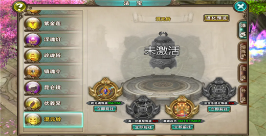 当少侠您把混元铃的所有属性都淬炼到满值之后,就可以开始进化啦!进化需要消耗80w法宝精华、1900张灵符、3个琉璃火、1个潜修丹