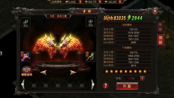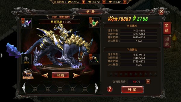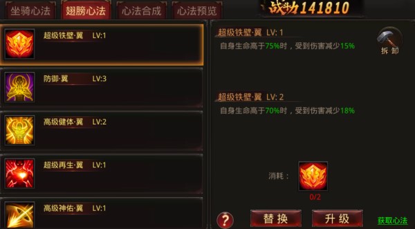 提升坐骑和翅膀等级,装备心法提升战力。拆除或替换心法可返还材料。