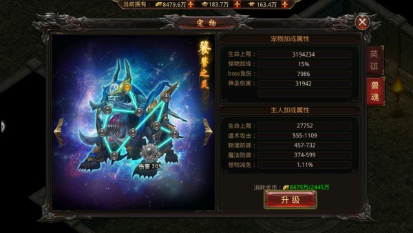 包括宠物、兽魂、幻化、兽灵,升级宠物,提升属性和伤害。