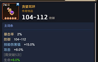 第二个推荐携带的饰品是贪婪耳饰,他的主属性也是防御,效果是增加百分之二的暴击率以及百分之十五的技能冷却时间和攻击力,这件物品因为不加技能伤害,所以优先级上比不过黄金怀表,但因为可以增加暴击率,所以差距也不是太大。
