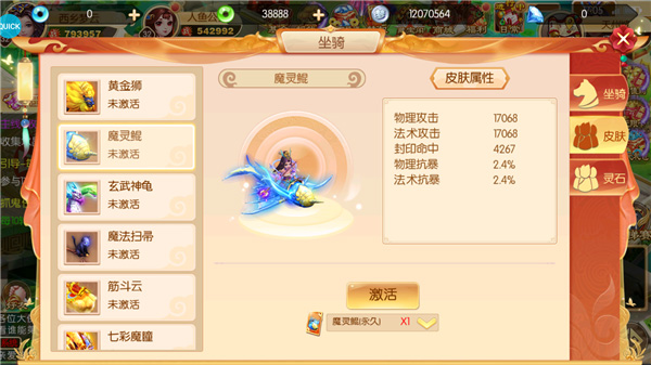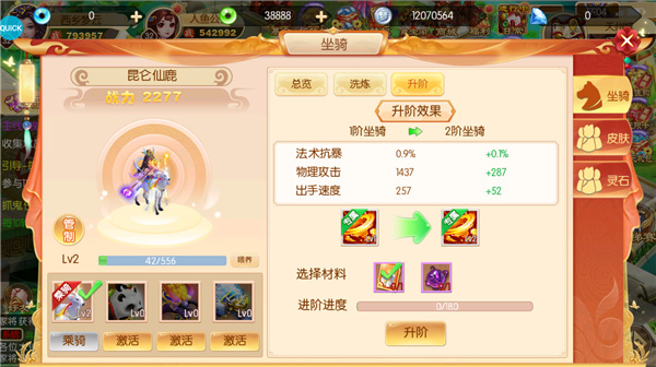 激活坐骑后,可根据属性选择骑乘和控制的坐骑。0氪玩家建议保持主角、宠物和坐骑属性一致,而土豪玩家可根据不同属性选择适合的坐骑。
