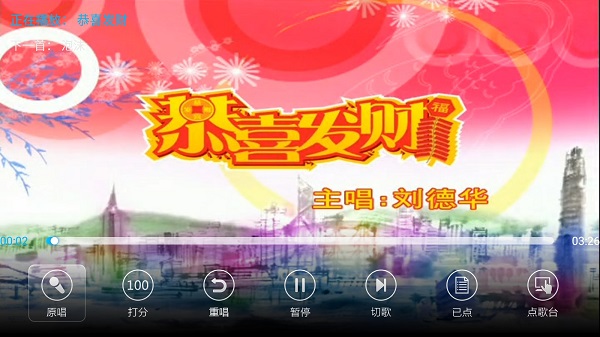 4、开始唱歌后,想调东西点点屏幕菜单就出来了,你可以调原唱声音大小,或者只要伴奏,还能打分、重来一遍、暂停或者切到下一首,想怎么玩就怎么玩!