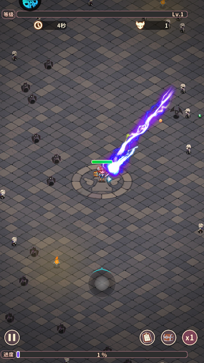 3、滑动屏幕来控制角色的移动,避开怪物的攻击。屏幕上方显示的是当前等级和经验条,下方则是关卡进度