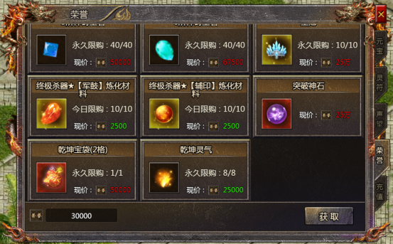 1、开启后,玩家可以使用荣誉值在商城中购买各种商品。