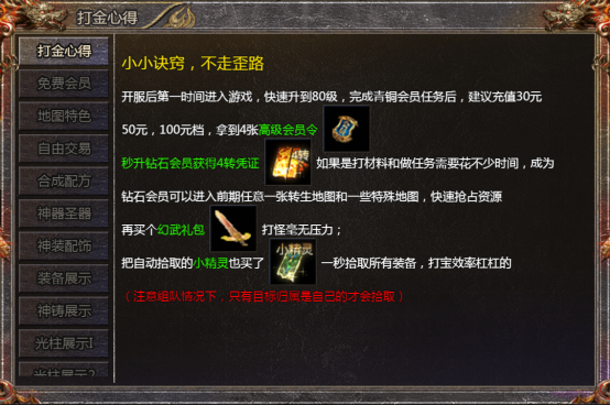 钻石会员可进入高级地图,抢先占领资源。购买幻武礼包,提升打怪效率。同时,投资自动拾取小精灵,提高打宝效率。