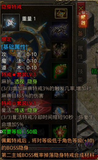 隐身戒指:使玩家在怪物面前隐身,避免被群攻至死,有了隐身戒指后可以安心挂机,但隐身效果受级别限制,请注意级别要求。隐身戒指提升攻击力,收集碎片升级可进一步增强战斗力。
