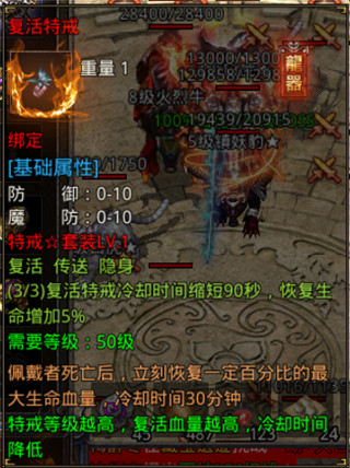 复活戒指:允许玩家在死亡后立即以一定的血量复活,特戒等级越高,复活的血量越多,冷却时间越短。复活戒指增加防御力。
