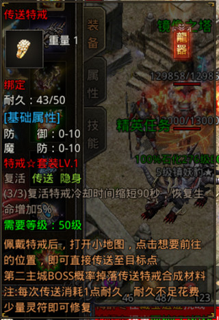 透视戒指:可以预知怪物可能掉落的装备,决定是否挑战高级怪物时可先进行透视。透视次数有限,根据怪物等级消耗耐久,耐久在一小时后自动回复。透视戒指增加攻击力,即战斗力。