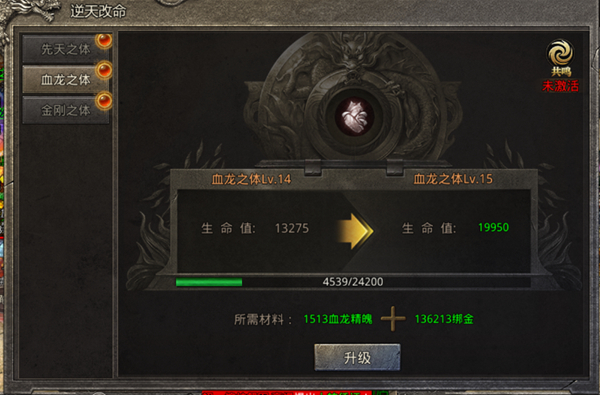 需要消耗血龙精魄和绑金来提升血龙之体等级,以增加角色的生命值,血龙精魄可以通过特定挑战和市场获取。