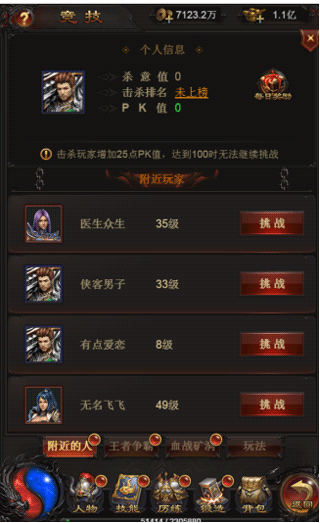 b.选择挑战的对手,胜利可以获得金币、装备、经验奖励。失败则无奖励。