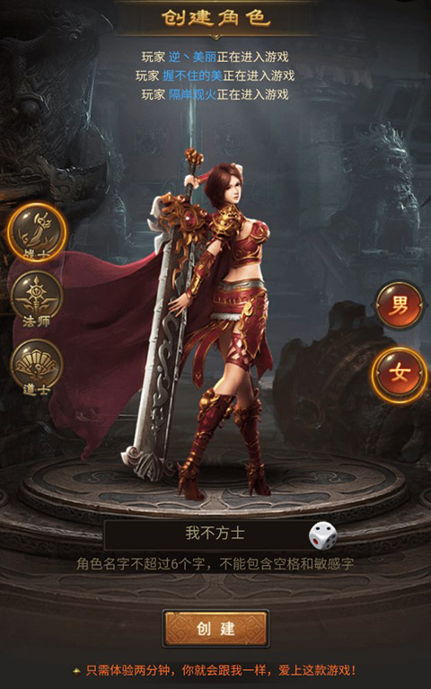 1、角色创建玩家一开始需要选择自己喜欢的角色职业,可选职业包括战士、法师和道士,每个职业都有其独特的魅力和战斗风格。