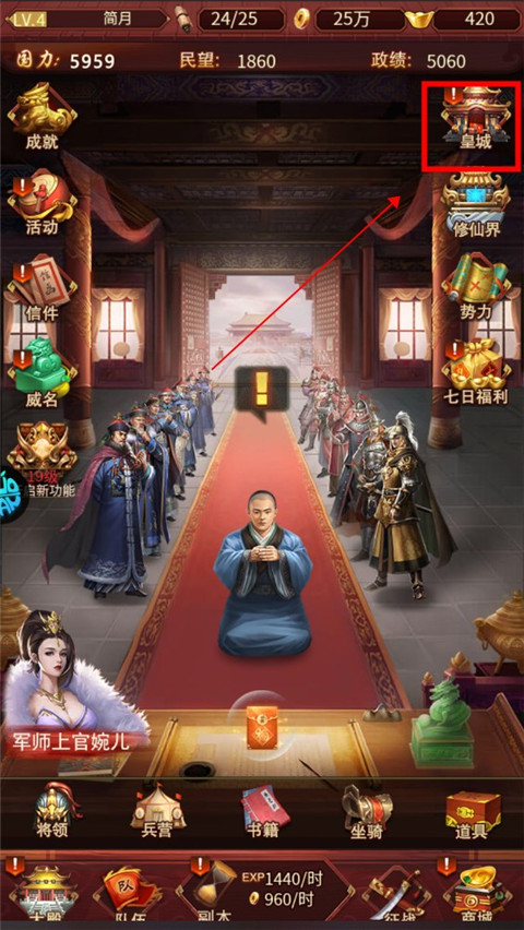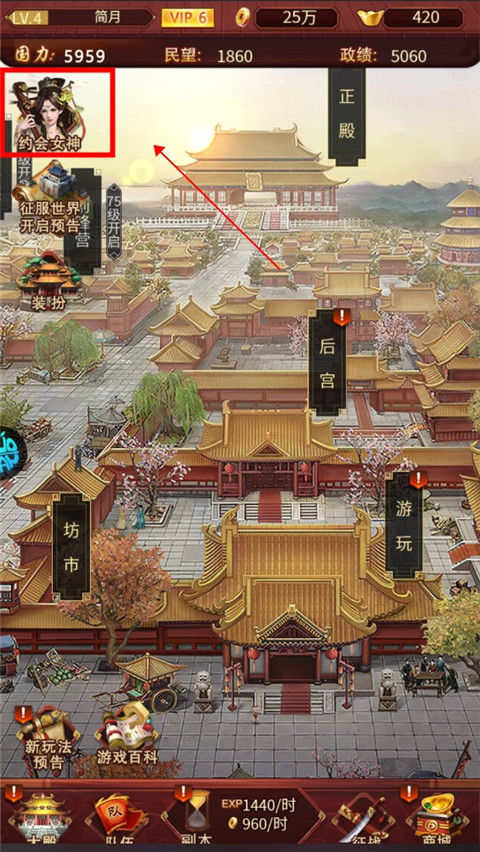1、新手教程完成后,玩家可进入皇城探索后宫养成的乐趣。