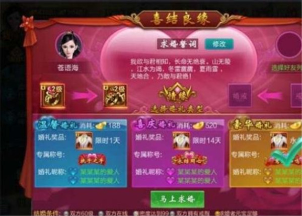 结婚仪式有温馨、喜庆、豪华三种类型,各自有不同的奖励、称号和消费元宝的数量差异;
