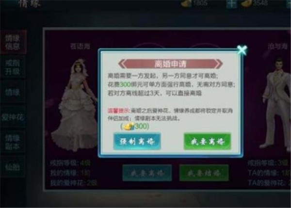 结婚后可培养情缘,增加恩爱值,离婚会锁定培养进度,保留已有属性,取消双方属性加成。