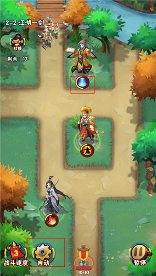 2、在进入关卡挑战后,侠客们会自动攻击敌人进行防守,同时积攒能量,满格之后可以释放,玩家可以手动释放也可以点击自动,解放双手。