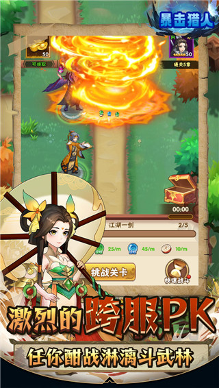 暴击猎人手游暴击猎人手游是一武侠角色扮演放置手游,游戏的故事背景发生在一个充满机缘与危机的武侠世界中,玩家将不断的战斗冒险,在这个世界开创一个传奇故事。在这里阵容的搭配非常重要,运用属性克制的关系,并将侠客们放置在合理战斗站位搭配阵容。一个合理搭配的阵容可以发挥出一加一大于二的效果,帮助你轻松击败各种强敌。暴击猎人手游有着自动战斗的机制,开启该机制后,角色们会自动闯关,并且在关卡中也不需要你去操纵角色释放技能,玩家可以花费更多的精力投入到其他的玩法中去。此外,游戏还支持多人组队,你可以和其他的玩家们一起组队冒险。喜欢的朋友快来本站下载游戏体验吧。