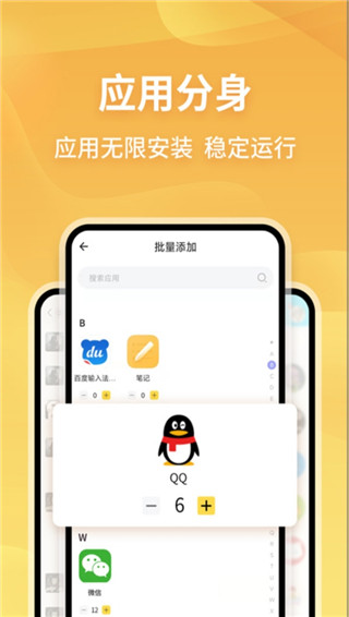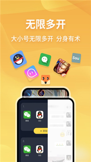 1、轻松进行分身,一个应用轻松多添加,这样以后可以同时登录几个账号啦!