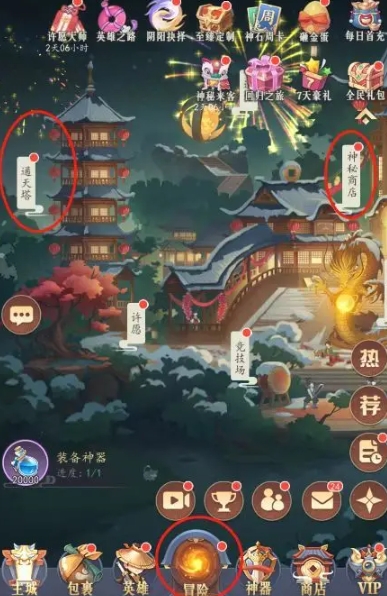 2. 冒险的每日挂机经验、通天塔、神秘商店