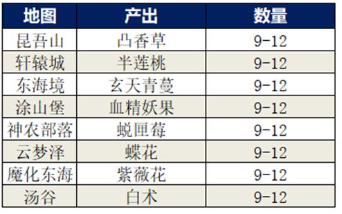 接着我们看一下采药。采药是一个比较简单的内容,我们可以通过升级采药术来解锁新的采集点,不同的采集点会产出不同的草药物品,可以根据需求去相应地点采集,然后炼制丹药,再也不用担心迷路了!这个可以在生产系统里通过选择不同的场景预览查看,我觉得这就是个白给的系统~只要有活力,就可以尽情的采集,美滋滋。