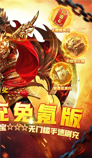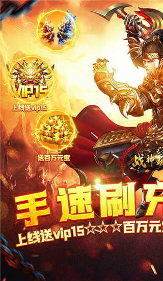 1、注册即赠VIP15级待遇,百万元宝和千万金币纷送,以及独有的武圣战神限定时装套装!