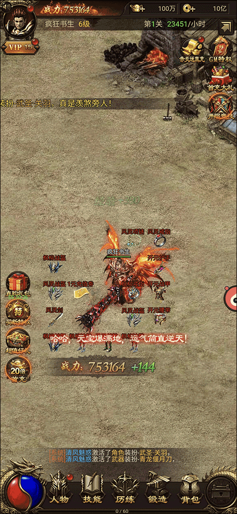 战神霸业手游精心打造了一款沉浸式的arpg自动挂机游戏,完美再现了传奇游戏的经典场景。玩家在这里可以体验到原汁原味的传奇世界,游戏一开始便赠送VIP15、100万元宝,还有稀有的动态武圣时装和顶级神器装备等你来领。战神霸业手游中的一刀999伤害,元宝满地掉落,让人留连忘返,玩家每天登录游戏,即可无限领取真充卡,轻松成为游戏中的土豪,而且BOSS无限制掉落元宝、真充卡和顶级道具装备,资源返利高达千倍,新推出的珍宝阁更是以一折的价格提供各种珍稀物品。总之战神霸业手游带你享受前所未有的超级福利,快来加入战斗吧!