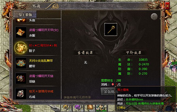 随着炼魂等级的提高,需要消耗的魂之精石数量也会增加。不仅如此,一旦装备炼魂到一定等级,还能激活额外的套装效果,进一步增强装备属性。值得一提的是,炼魂后的属性加成在更换装备后依然有效。