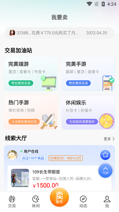 现在的游戏越来越多,很多游戏爱好者都玩过七八款游戏吧,但是现在基本上还在玩的就只有一两款了。那么闲置的游戏大家就可以拿出来售卖了。今天小编就给大家带来游戏交易软件大全,其中有交易猫、寻宝网、网易buff、网易藏宝阁等,这些软件都可以进行游戏账号交易,并且绝对安全靠,每一款都是小编精心挑选出来。有需要的小伙伴赶快下载软件出售你的账号,赚取零花钱吧。