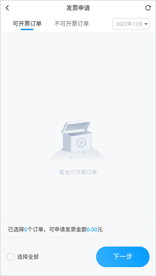 4、这里可以看到可开发票的订单,选择完成后点击下方的下一步就好了
