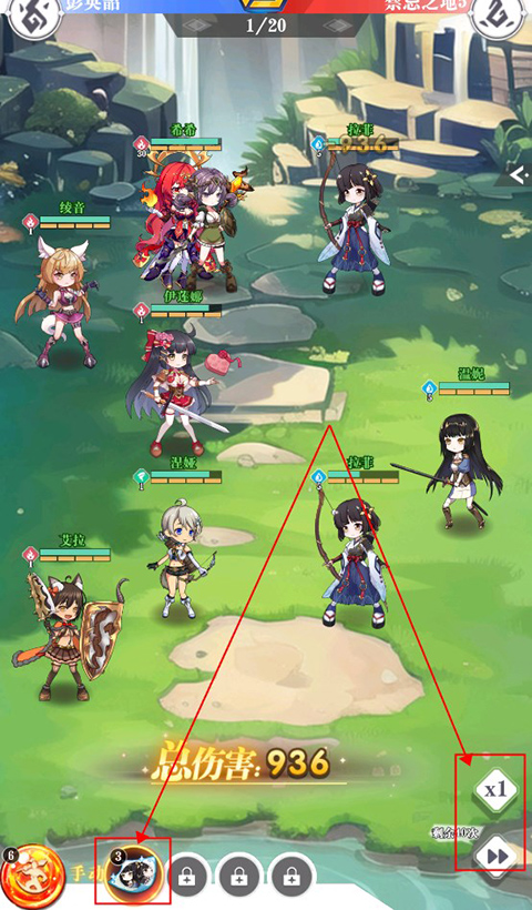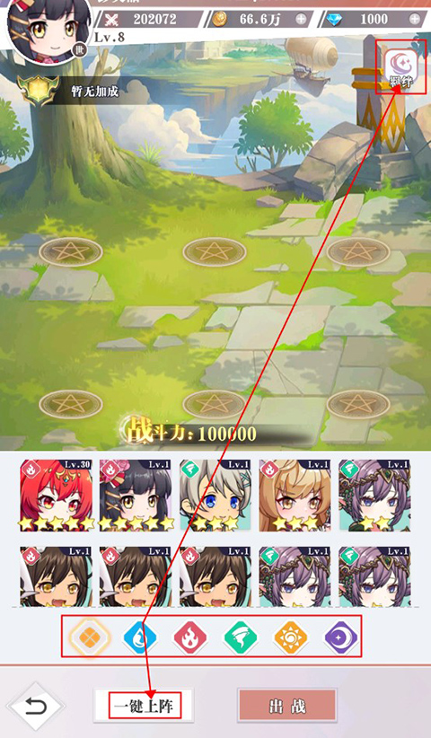 冒险前,玩家可调整阵容,根据英雄间的羁绊关系来优化队伍配置,点击右上角可查看羁绊详情,或使用左下角的“一键上阵”快速布阵。