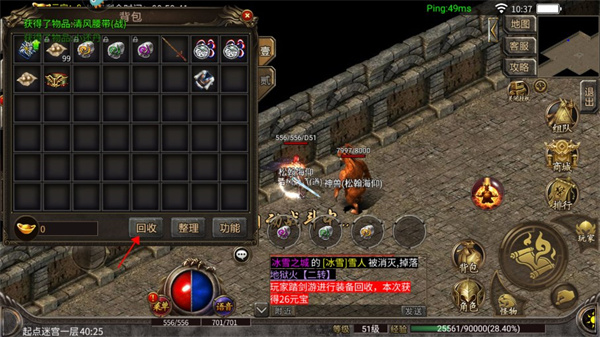 3、在战斗地图中,可以通过选择背包进入装备回收。