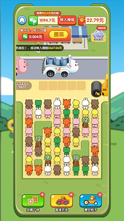 2、匹配相同类型的小动物上车,增加了游戏的互动性和挑战性;