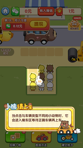 小熊请上车是一款富有创意的益智类游戏,挑战玩家通过策略性地点击消除相同颜色的方块,以帮助色彩各异的小熊顺利地登上与它们颜色相匹配的车辆。游戏设计了多个不同难度的关卡,每一关的目标各不相同,为玩家提供了丰富多样的游戏体验。