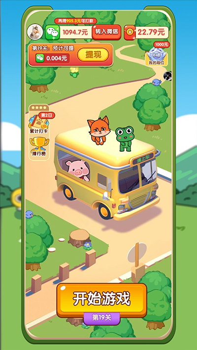 3、成功将3个小动物送上车即可发车,设计了游戏的进度感;