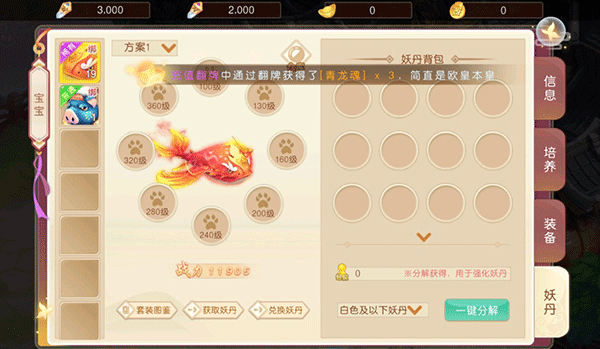 4、宠物妖丹功能,可大幅增强宠物能力,需主角等级达到100级方可使用。