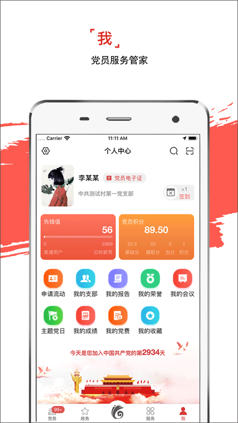 1、首先,进入到软件中,点击党务板块中的党员积分,再点击自评选项