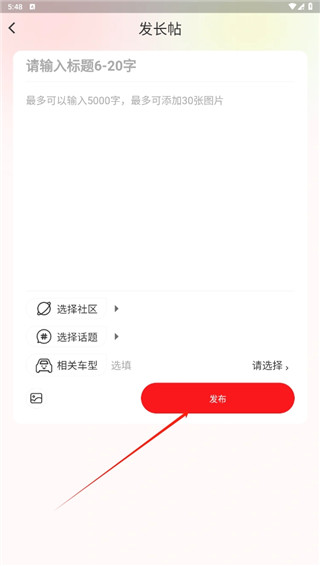 3、小编选择发长贴,输入标题和内容后,在选择社区、话题、相关车型点击发布