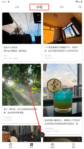 2、在发现板块中,点击小记,再点击下方的加号图标