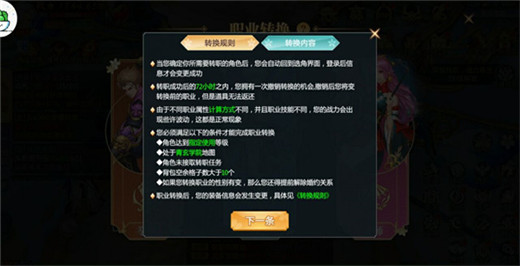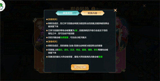 完成前置任务获得转职卡后,接下来就可以准备转职了,点击使用,然后会弹出转职规则和转职说明,大家要仔细阅读哟