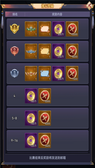 比赛结束后按照最终排名通过邮件发放排名奖励。想要炫耀自己的战利品吗?那就快来争当中原霸主吧!