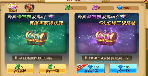 游戏里的武将技能获取方式就是看脸,通过技能抽取来获得大量的武将技能,一共有两种宝箱,紫色的比绿色的更容易获得好的技能,不过当然也更贵。想要赌一把的同学不妨来试试吧!