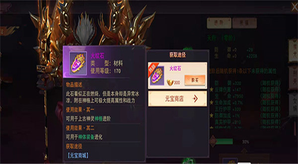 火纹石表面上看似正在燃烧,但是火纹石的本身却是异常的冰凉,火纹石是附着在神格上的,可以很大程度上提高上古神灵的属性和战力的,火纹石有两种使用方法,一种是在上古神灵中提升神灵的神格进阶,第二种是可以用于神体的装备进化,火纹石可以在元宝商城中进行获取,玩家只需要300元宝就可以获取一枚火纹石。