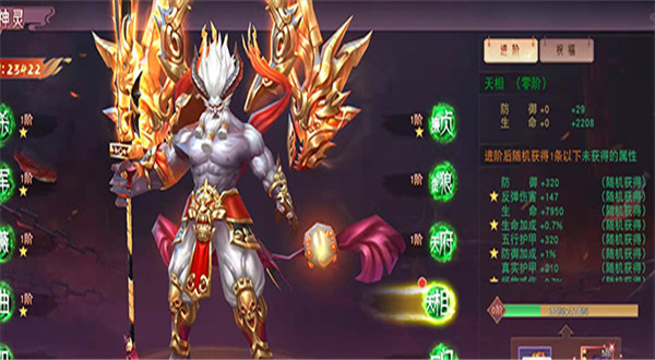另一位是刑天,最后一位是女娲,小编暂时就一位上古天神蚩尤,每一位上古天神都有进阶和祝福两个功能,今天主要讲进阶功能,如果玩家刚刚拥有上古天神,那么该天神的天府是零阶,防御力和生命力都是0,如果玩家进阶后可以随机获得一条系统所给的属性,是随机的不是玩家可以选择的哦。