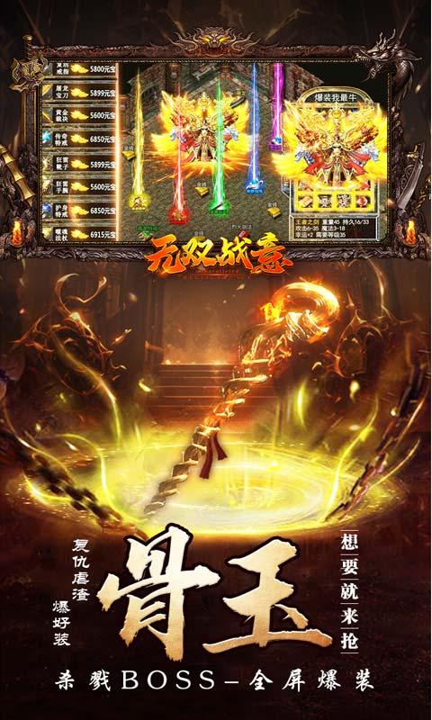 无双战意热血版的挑战BOSS玩法非常好玩,这里有着各种各样的BOSS,其中有骷髅王、白骨精、黑熊王等,这些BOSS都非常的强大,想要顺利击败BOSS需要做好充足的装备,购买到道具、将战力提升到最高是比不可少的。击杀BOSS后可以获得大量的稀有道具,运气好还可以获得限量顶级装备。感兴趣的朋友快来下载游戏体验吧。