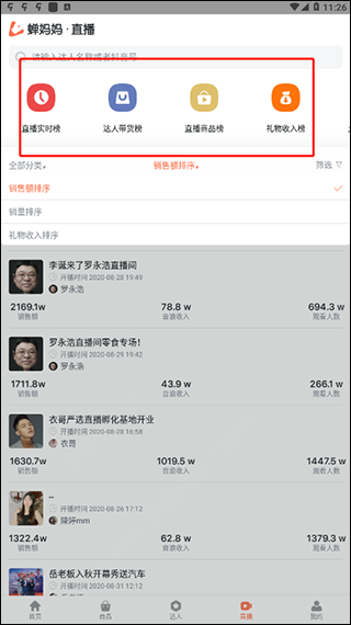 4、在直播板块中,可以看到直播实时榜单,达人大火榜单,礼物收入榜单