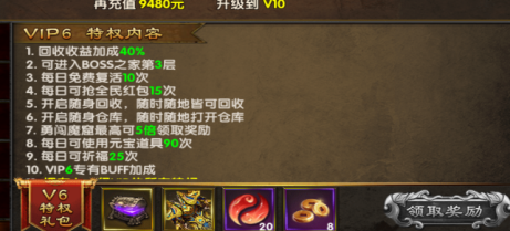 1.新手玩家刚开始充值至少达到v6,v6有一个装备自动回收,这样背包装满的时候会触发,晚上就可以安心的挂机刷boss,可以刷元宝、装备、等很多材料!