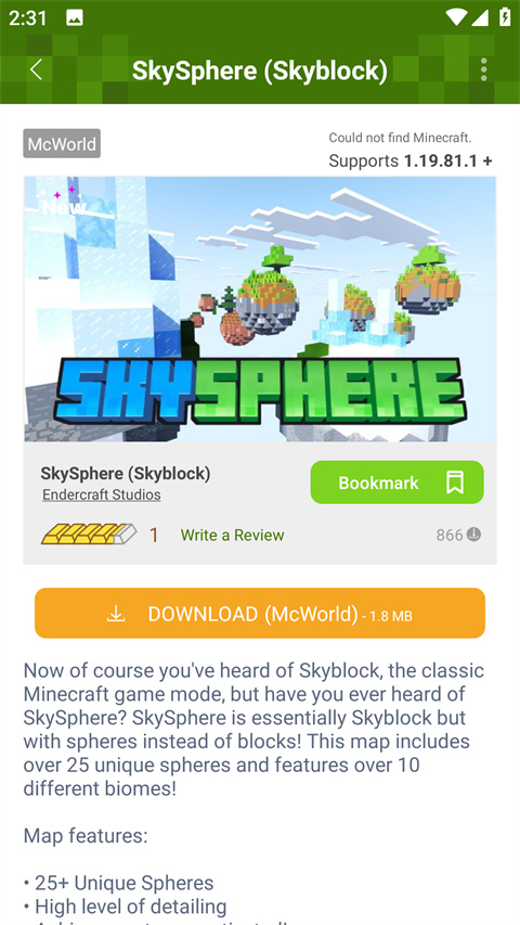 2、在模组的介绍界面中,点击下方的黄色下载图标,我们可以看都内存为1.8mb