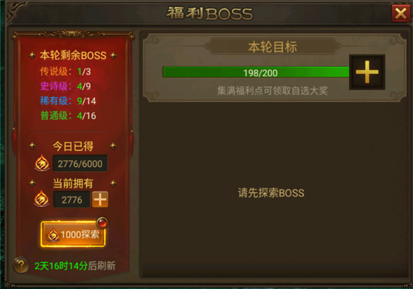 击败福利BOSS还能获得福利点,达成目标即可选取一件装备(每轮目标达成后的装备品级有所不同)。